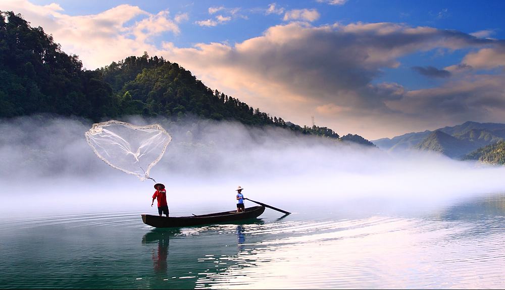 慢慢的,靜靜的江面上,一層乳白色的霧靄平整地鋪展開來(lái),厚厚的,沉沉的,像一床柔軟的絲絨棉被,霧的質(zhì)地越來(lái)越厚,幾乎連眼簾都要被水汽氤氳了的時(shí)候,日光忽然刺破濃霧,那霧便漸漸地收回去,終至一條,閑閑地橫在水中。青山如黛,晨清幾許中有漁人駕著竹棚小舟幽幽而來(lái),船頭掛一紅燈籠,于一派云霧中居然有著一種隱喻般點(diǎn)睛的效果。